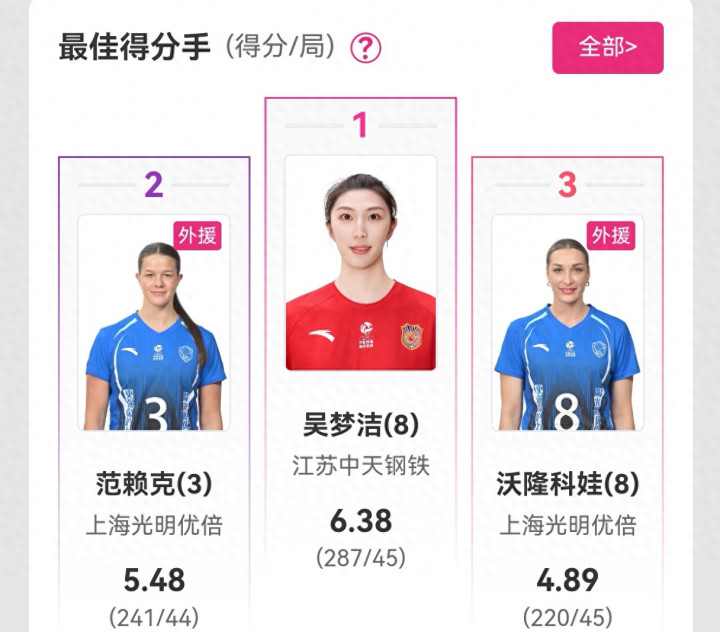 毫无疑问,作为中国女排国家队的主力主攻,吴梦洁的数据无疑是出色的,她以单局6.38的得分排在所有球员的第一位,紧随其后的是上海女排的两个外援范莱克和卧龙科娃,单局的得分能力是最能体现边攻实力的,很显然作为上届联赛的MVP,吴梦洁的确成长了。除此之外,吴梦洁也以287分的总得分排名所有球员第一位,以21个发球排在所有球员第二,最佳扣球数和单局扣球得分都是排名第一的,这也意味着她的比赛打的非常的辛苦。